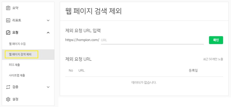 ‘요청 > 웹 페이지 검색 제외’는 수집 요청과는 반대로