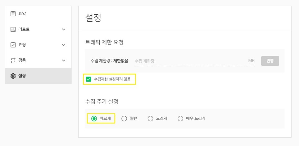 ‘수집제한 설정하지 않음’에 체크해 주시면 됩니다.